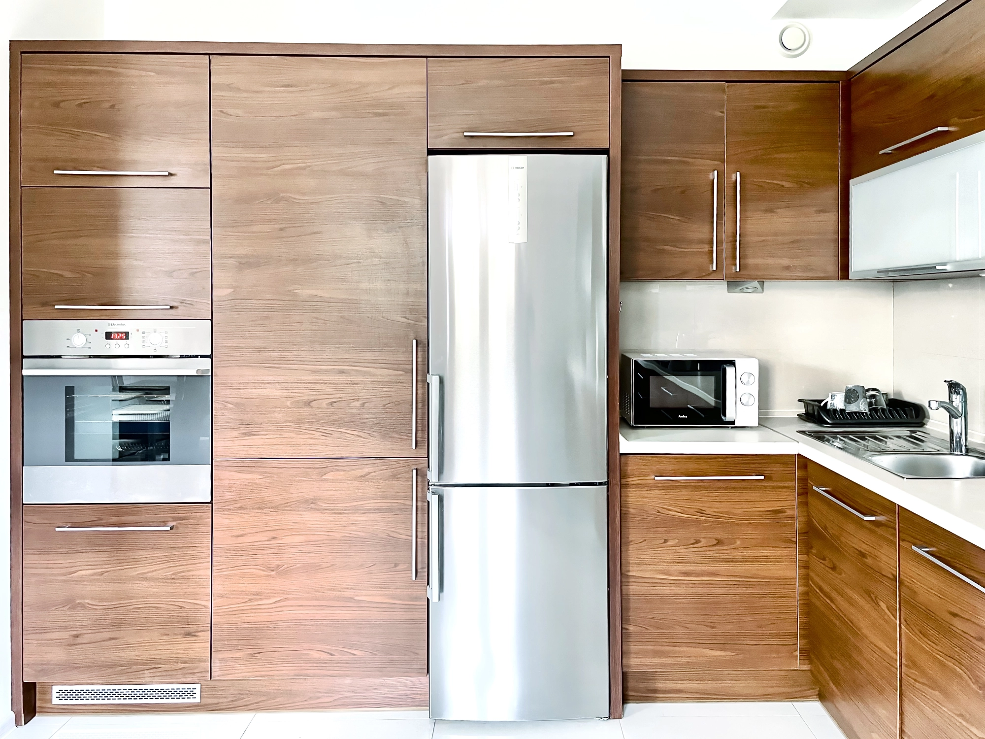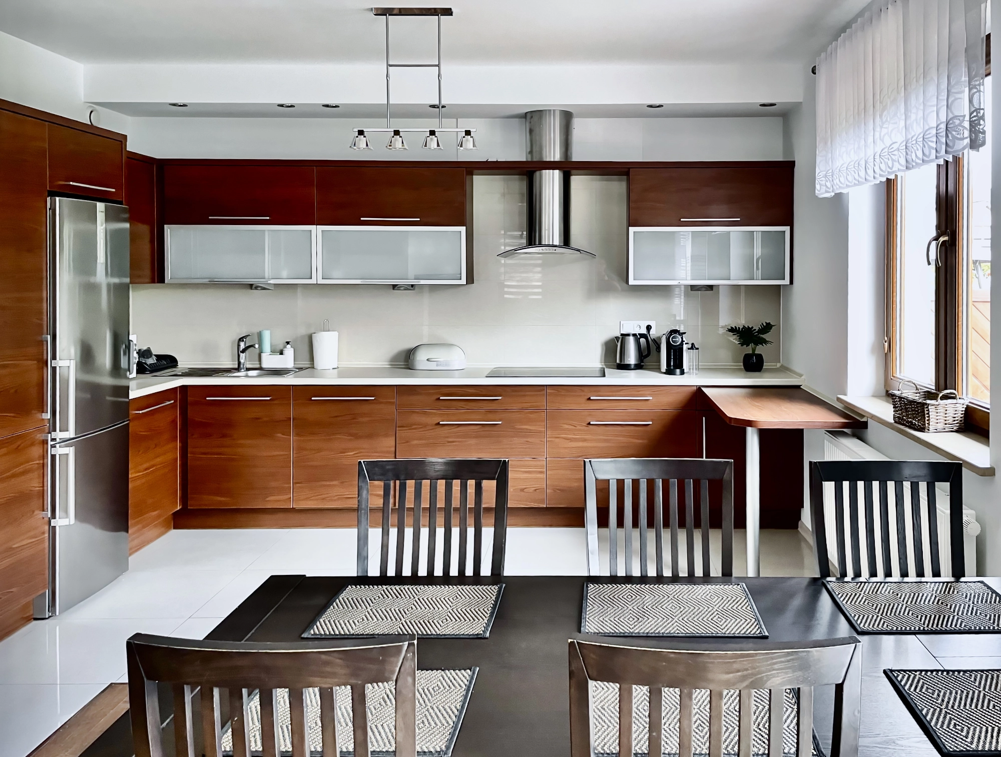 Kuchnia jest przestronna i otwarta, tworząc harmonijną przestrzeń z salonem. Znajduje się w niej lodówka z dużym zamrażalnikiem, zapewniająca wystarczająco dużo miejsca na przechowywanie produktów spożywczych.