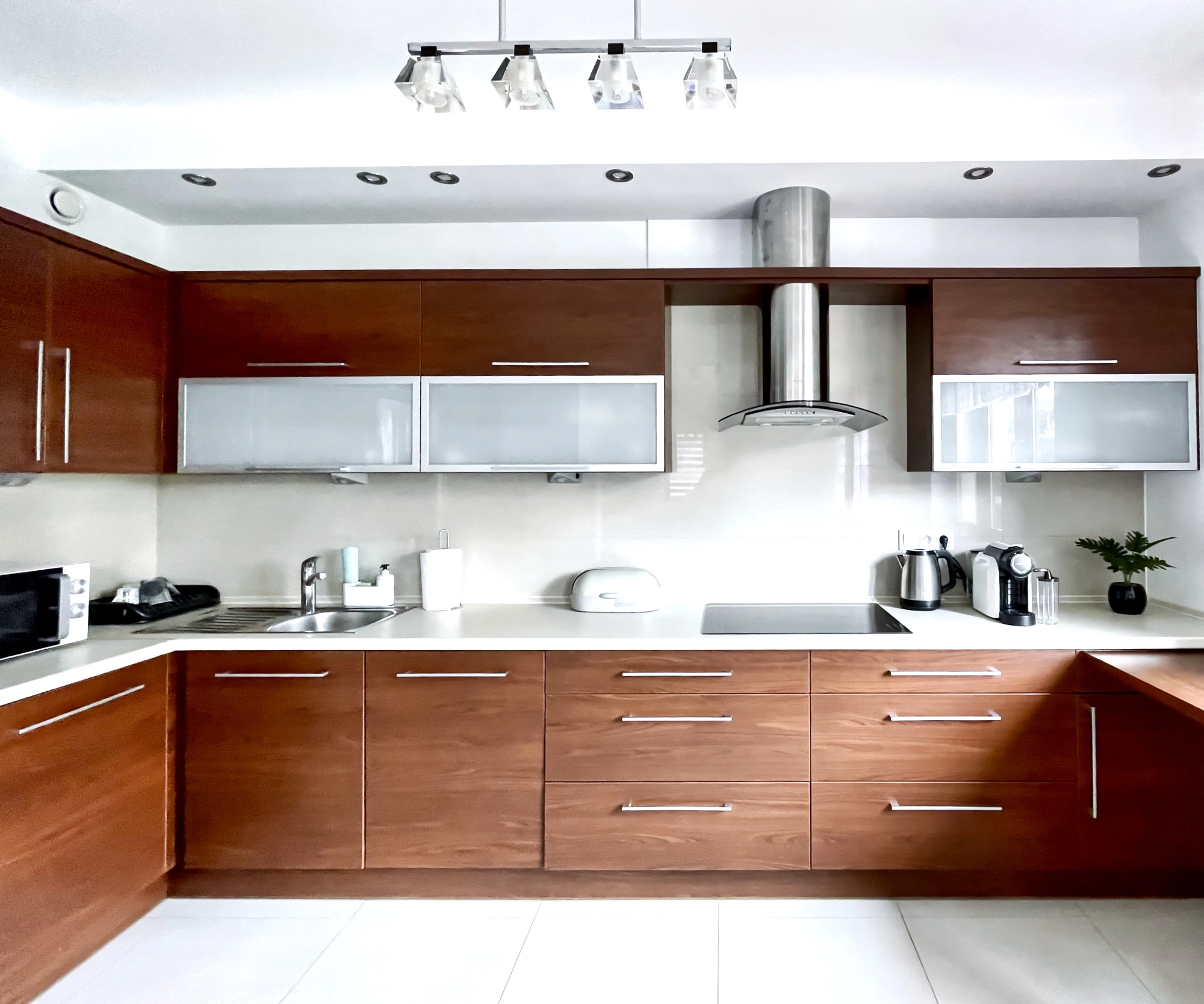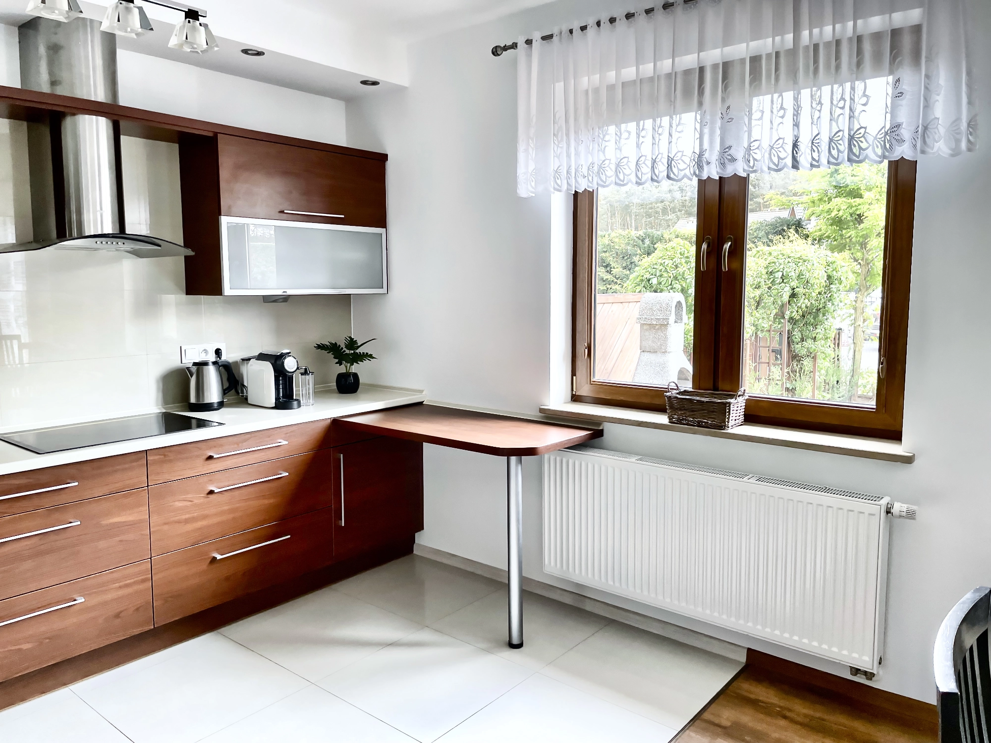 Kuchnia wyposażona jest w elektryczny piecyk oraz płytę indukcyjną, umożliwiając łatwe gotowanie różnorodnych potraw. Dla wygody Gości dostępna jest także zmywarka, ekspres do kawy, czajnik, mikrofalówka oraz pełen zestaw sztućców i przyborów kuchennych.